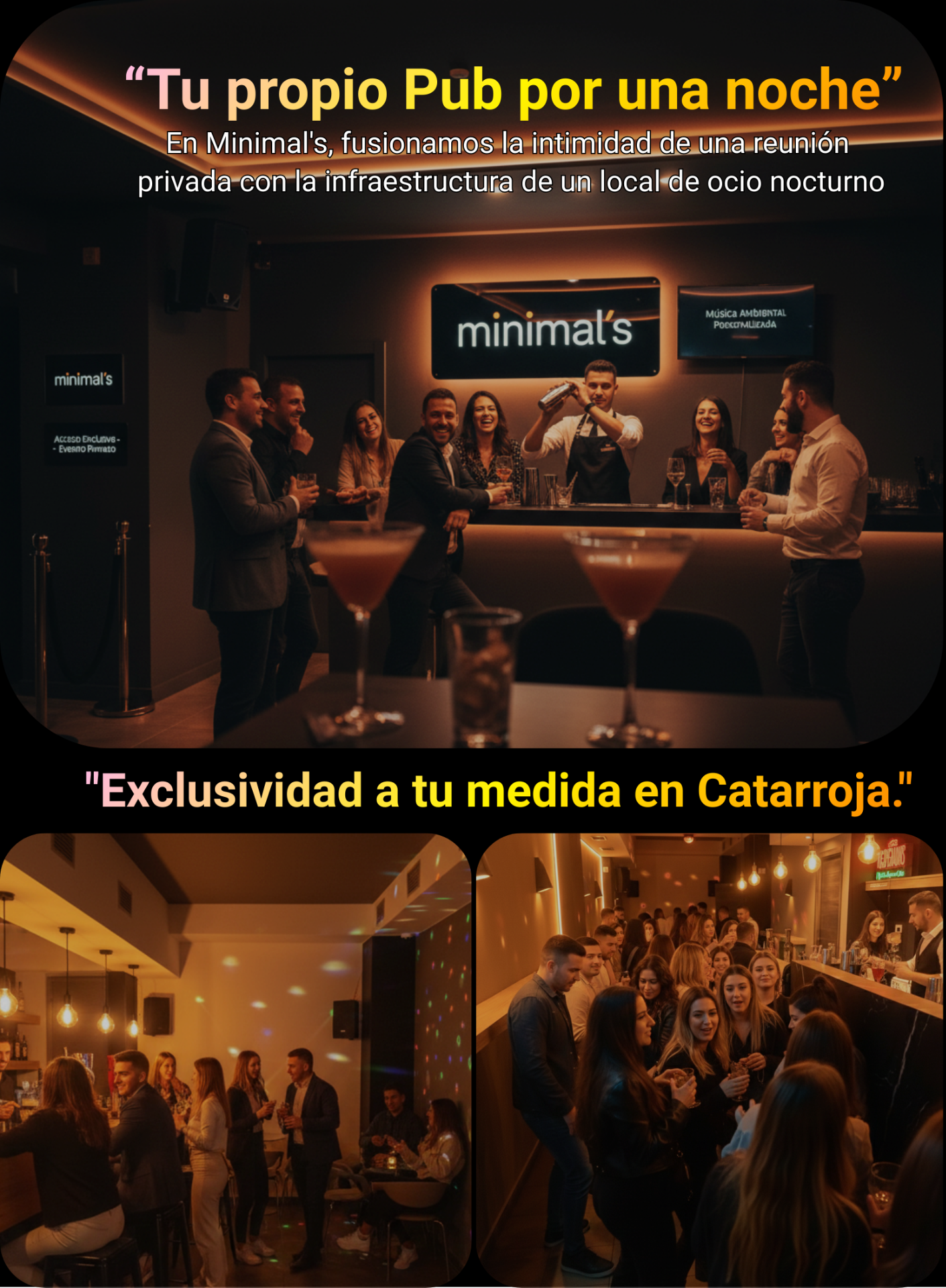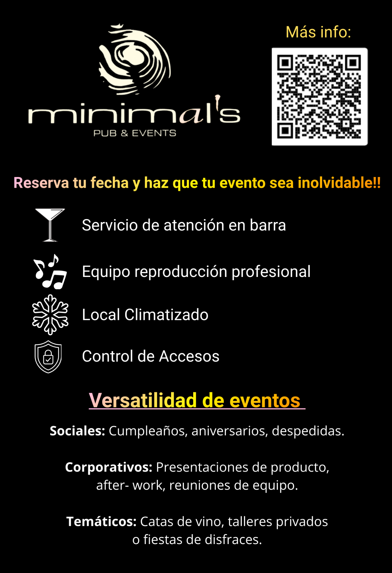 Descubre Minimal´´ s Pub & Events, este nuevo concepto esta diseñado para hacer posible un evento a tu medida con todas las comodidades y garantías de un local de ocio nocturno pero que podrás personalizar y configurar a tus necesidades. te invitamos a que nos conozcas a través de este sitio web y para cualquier duda o consulta estamos a tu disposición en el botón de contacto.